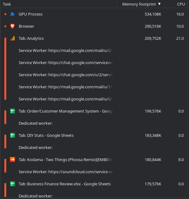 Tabby tab tabs. Brave is much better with memory than Chrome, about 40 tabs here using only a gig of memory.