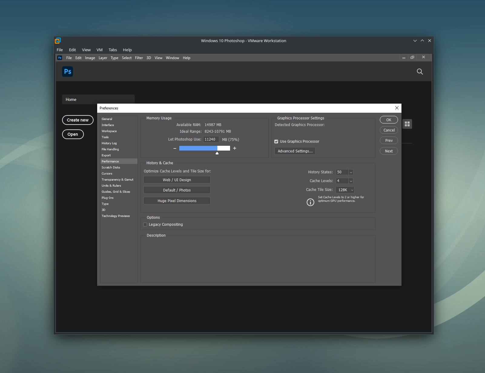 Photoshop with 16GB of RAM and 4GB of Video RAM in a VMware Windows 10 guest running on Debian Sid. It’s OK to use.